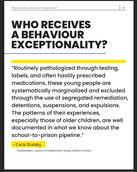 This section, placed right after the different categories of mental illness, brings the reader face-to-face with the human aspect of our work. It invites educators to think intentionally and deeply about why it is important to apply an anti-oppressive lens to behaviour needs in this way: