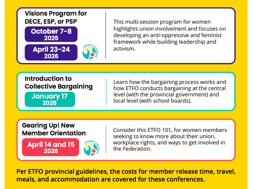 As per the provincial guidelines of ETFO, “the costs for member release time, travel, meals, and accommodation are covered for these conferences.” Do check out the programs and conferences that support your goals and sign up!